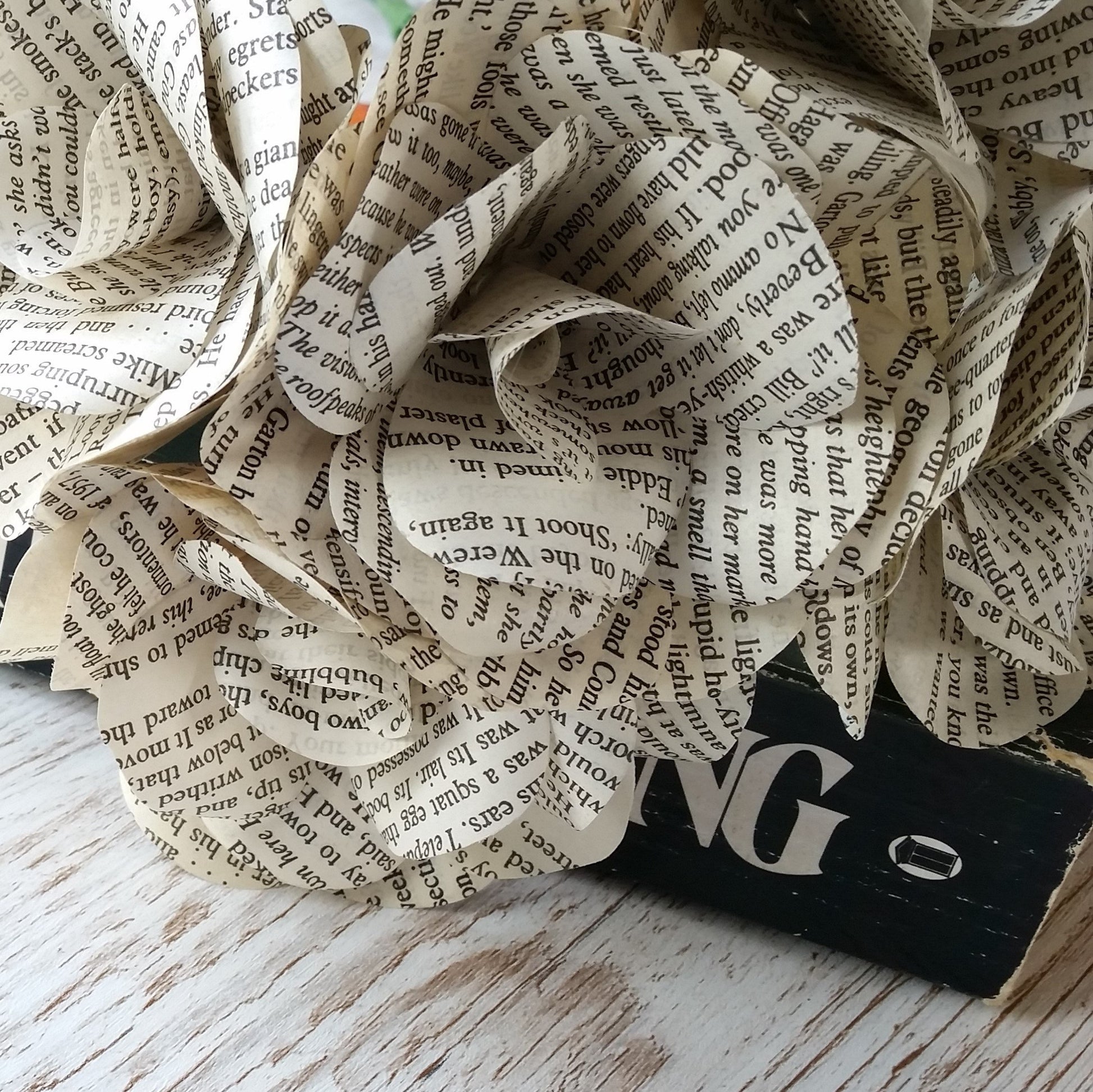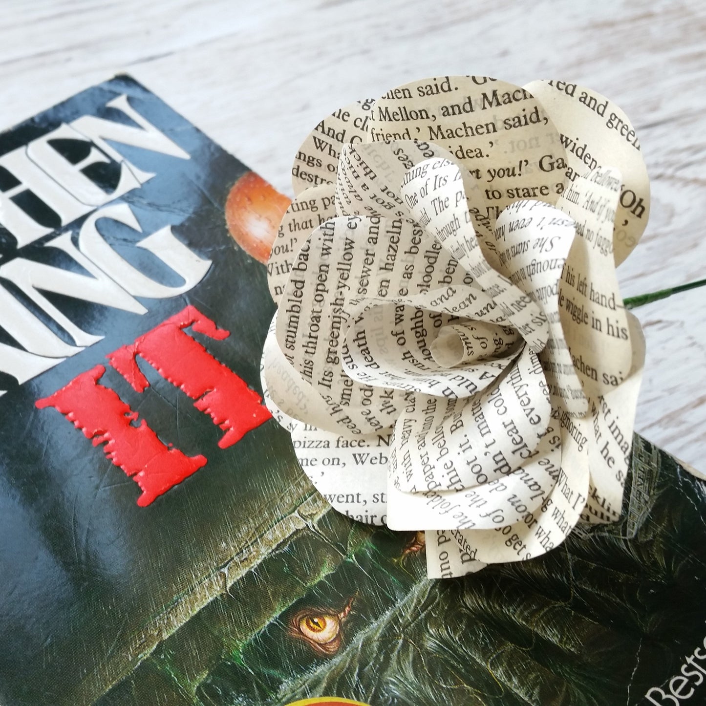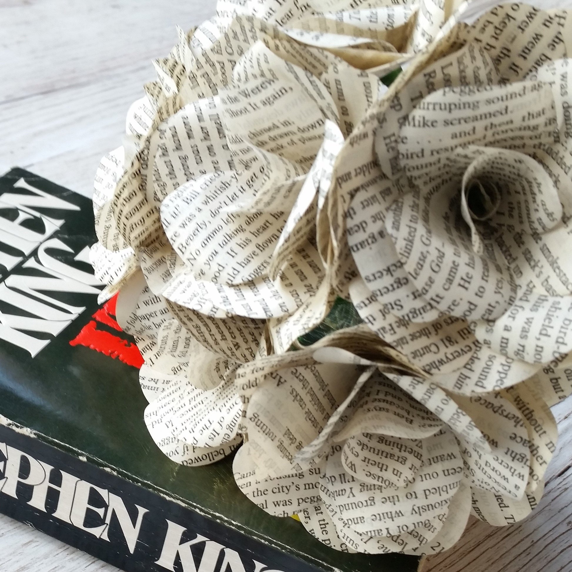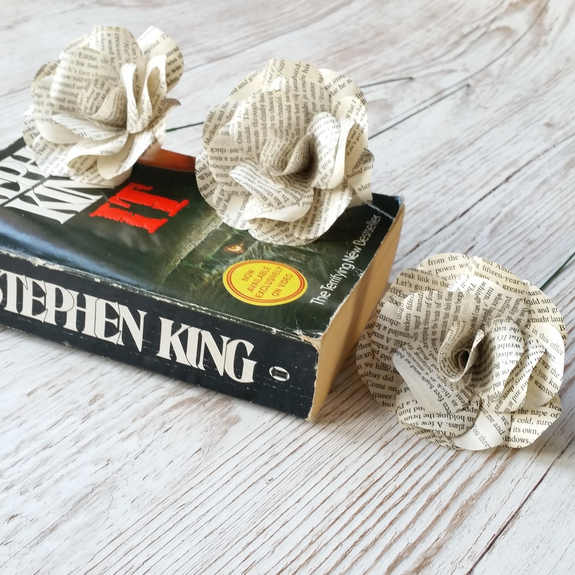 Handmade paper flowers made from the pages of Stephen King's book IT.