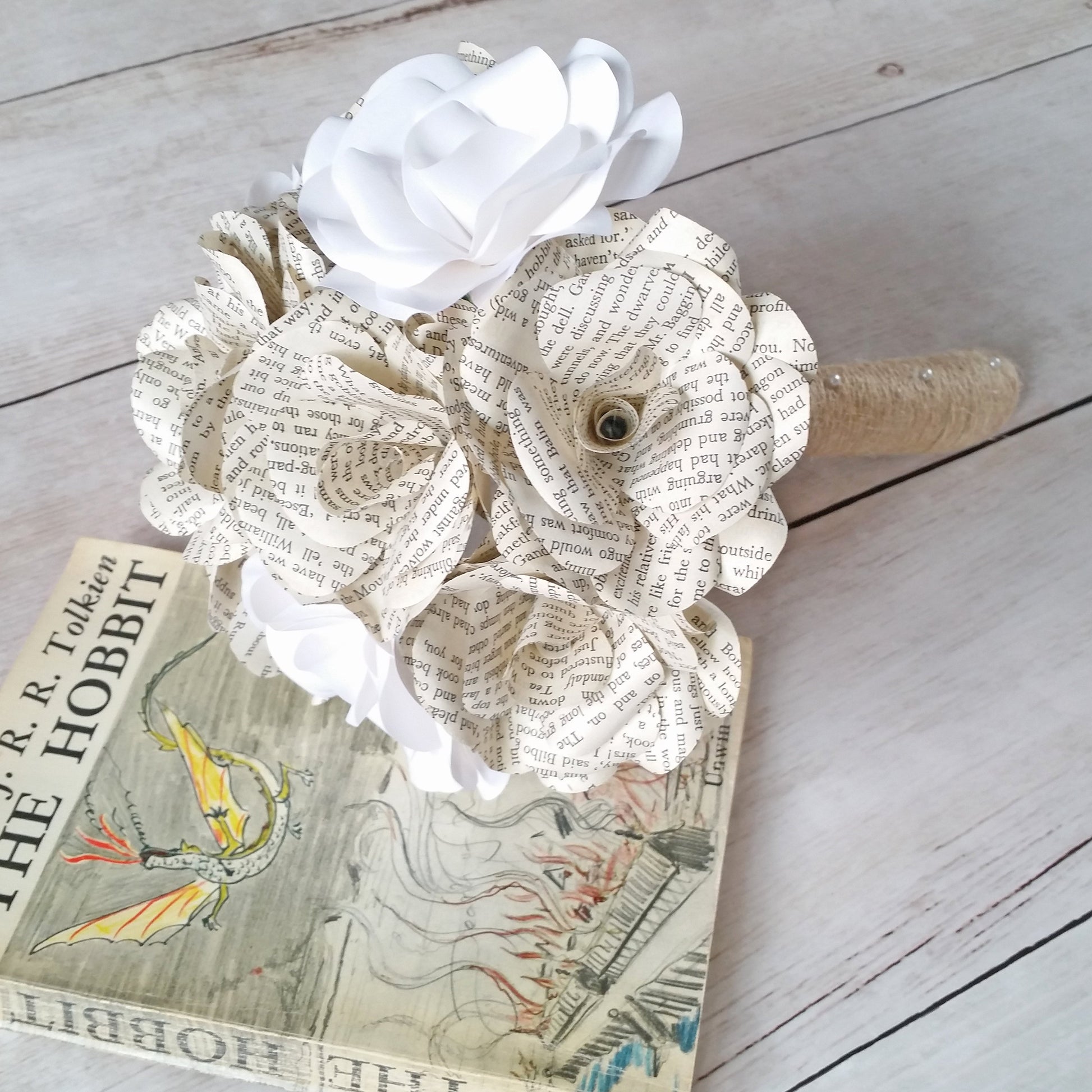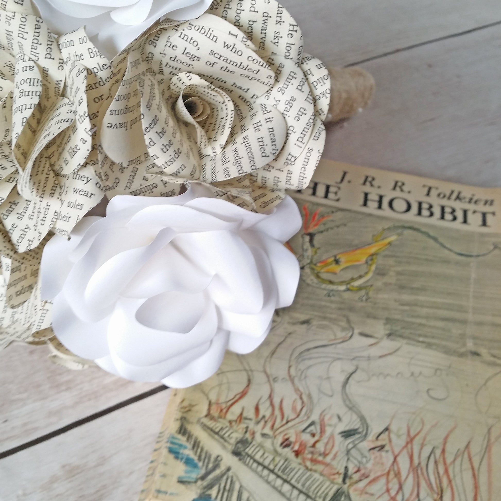 This beautiful bridal bouquet is made up of either 6, 9, 12 or 18 paper roses made from pages of The Hobbit & off white paper flowers.