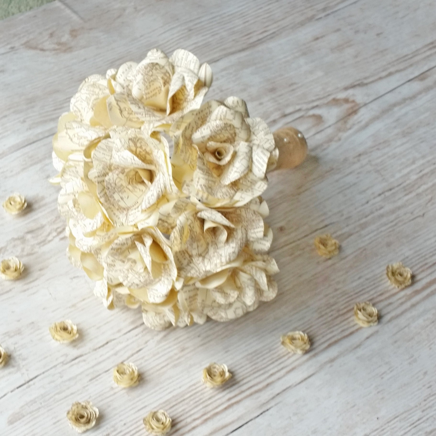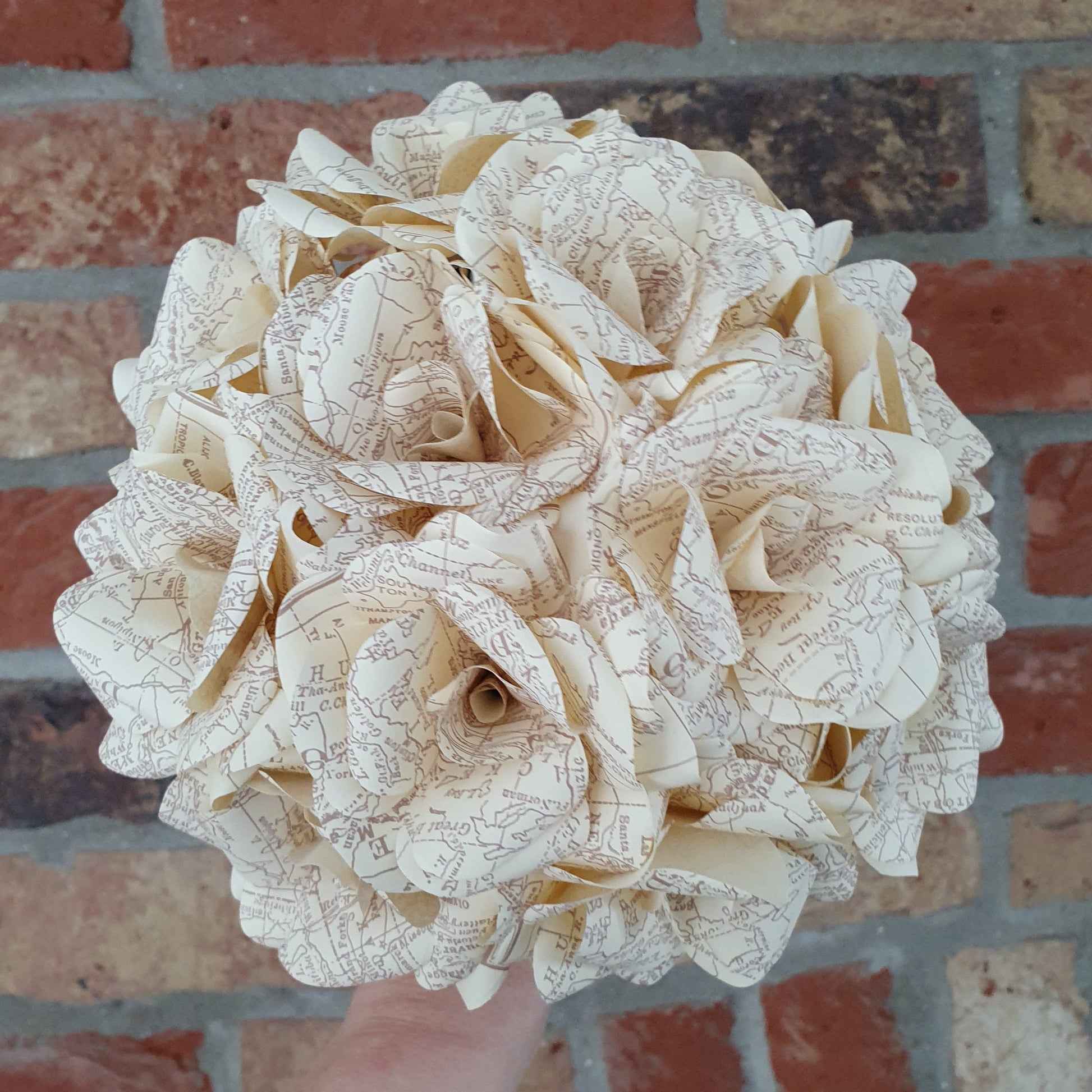 This beautiful paper flower bridal bouquet is made up of paper roses which have been individually handmade using cream paper with a vintage style map printed on it before being turned into a bridal bouquet with covered handle. It is available with either 6, 9, 12 or 18 map paper roses with brown burlap/jute handle.
