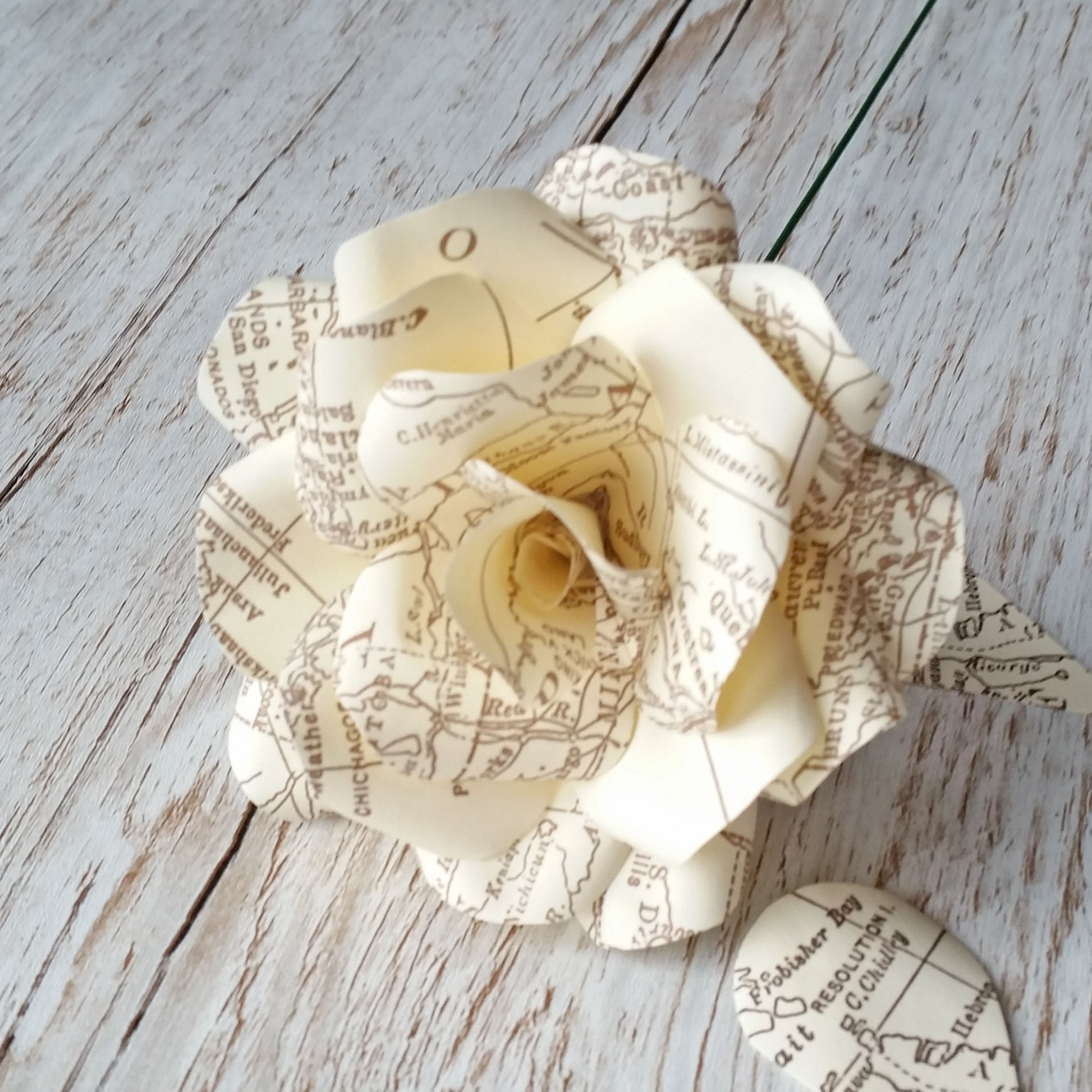 Beautiful handmade paper flowers made from cream/ivory paper printed with vintage style maps.